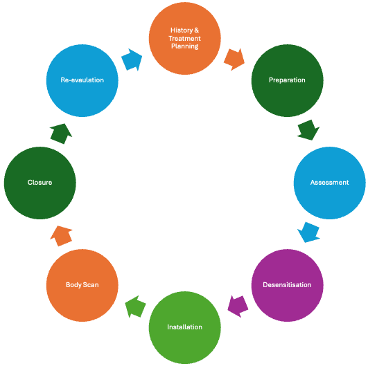 There are usually eight stages of EMDR, each being important to safe and effective therapy. Some stages are repeated each session as a core part of the therapy process; this tends to be stages 4-8. Other stages, such as 1-3, may take up the first few sessions, until you and the therapist feel ready to move on.
